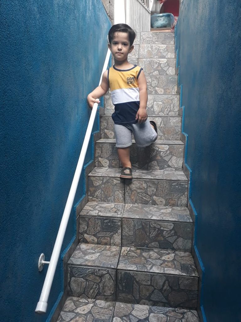 • Corrimão na escada de casa: o corrimão foi feito conforme altura do braço para melhor alcance do Enzo, já que por ser criança, a segurança é primordial. O fato do encurtamento das pernas para subir e descer degraus também dificulta um pouco mais o equilíbrio. Sendo assim, com a ajuda do corrimão, Enzo consegue ter acesso à escada sozinho, com segurança e sempre que necessário.
