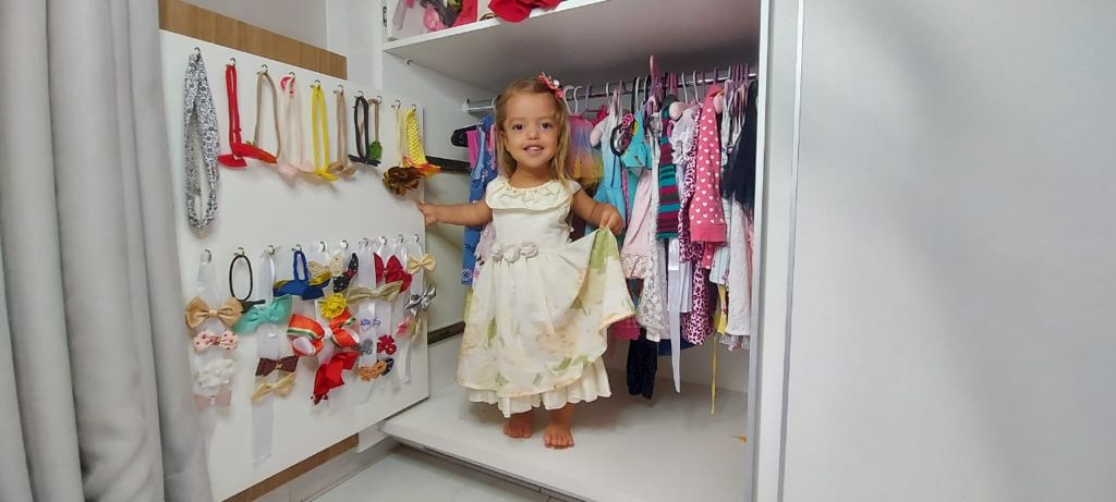 • Guarda-roupa com ganchos para acessórios: O guarda-roupas é um móvel do quarto que também estimula a autonomia da criança. Então os pais da Mel o deixaram com fácil acesso, que permite que a Mel abra, feche e mexa nos pertences que ficam mais visíveis. Assim, ela pode escolher melhor o que irá usar. Araras, gavetas e sapateira agora podem ser alcançadas pela Mel. A ideia era que ela pudesse escolher as próprias roupas, calçados e acessórios.