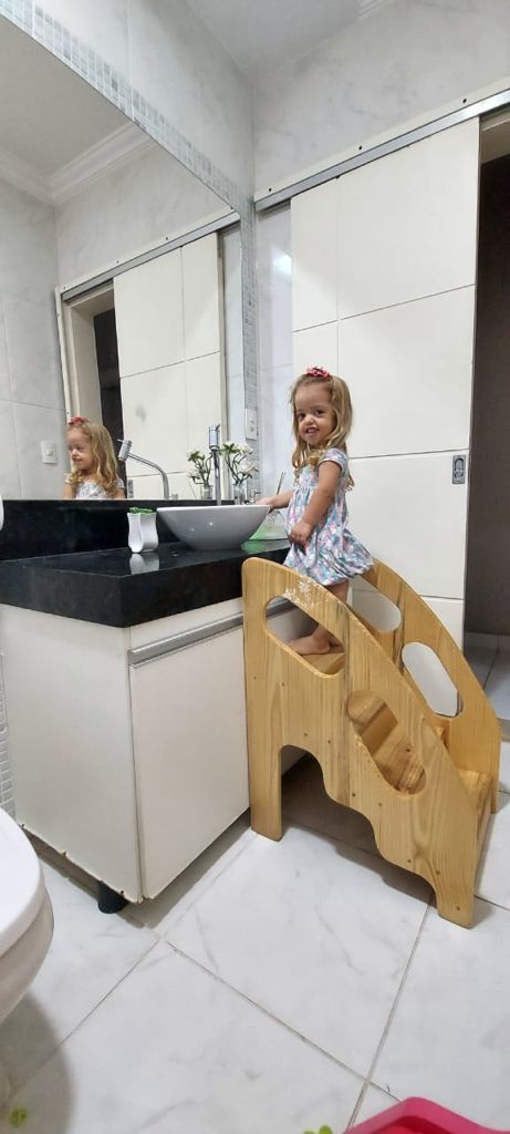 • Escada para acesso ao banheiro e cozinha: para a Mel desenvolver sua autonomia e independência, foi feita uma escada sob medida para ela usar a pia do banheiro, cozinha ou outro local onde a criança necessite de auxílio pela altura. A escada foi feita com a altura do apoio para as mãos conforme a altura de alcance dos braços da Mel. Foi medida a largura (espaçamento entre as mãos direita e esquerda para apoio) e também a altura dos braços dela (devido ao encurtamento dos membros), para assim ficar mais seguro quando ela for segurar e apoiar ao subir e descer a escada.