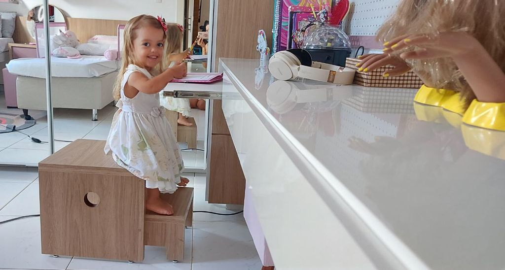 “Conforme as fotos, pode ser percebido que com a ajuda do móvel, a Mel pode usar sua penteadeira, sua cama e também realizar suas tarefas na bancada. Na bancada também teve uma adaptação na altura, para que fique mais baixa, colocamos uma base retrátil. Assim ela consegue apoiar melhor seus braços sobre a bancada, deixando sua atividade mais confortável e mais acessível. Não foi feito a adaptação em toda bancada, e nem em todo o ambiente do quarto porque a Mel compartilha o quarto com sua irmã, Carol de 7 anos, que não tem nanismo. E com o uso do móvel com degraus, o quarto fica acessível, seguro e confortável para ambas utilizarem”, explica Priscilla.