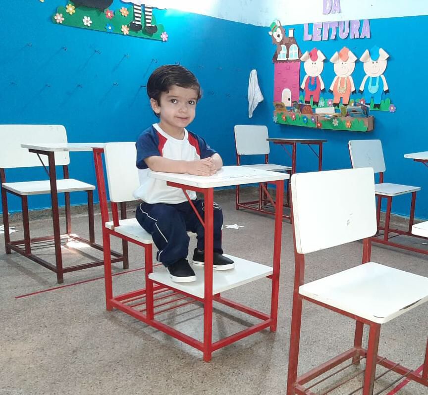 • Carteira escolar: a adaptação foi feita para garantir uma melhor acessibilidade, segurança, conforto para ele no ambiente escolar. As mudanças foram feitas no mesmo modelo da mesinha usada também pelos outros alunos, tendo pequenas modificações como: suporte para os pés e elevação do encosto das costas para um ter uma postura confortável, sem prejudicar a coluna e articulações. É muito importante ressaltar que a escola está aberta às mudanças e adaptações necessárias para que o José Eduardo tenha uma qualidade no ambiente escolar.