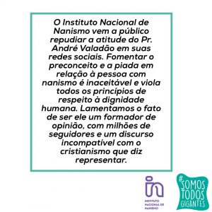 O Instituto Nacional de Nanismo (INN) vem a público repudiar a publicação do pastor André Valadão envolvendo pessoas com nanismo por meio de sua conta